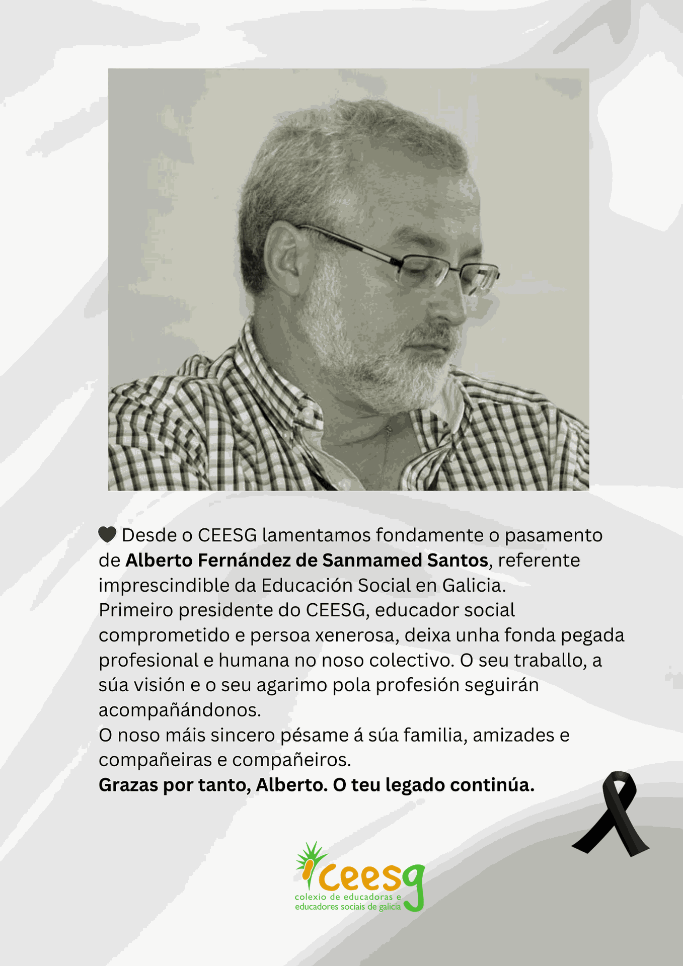 O Colexio de Educadoras e Educadores Sociais de Galicia (CEESG) lamenta fondamente o falecemento de Alberto Fernández de Sanmamed Santos, figura clave na consolidación e no recoñecemento da Educación Social como profesión en Galicia e no conxunto do Estado.