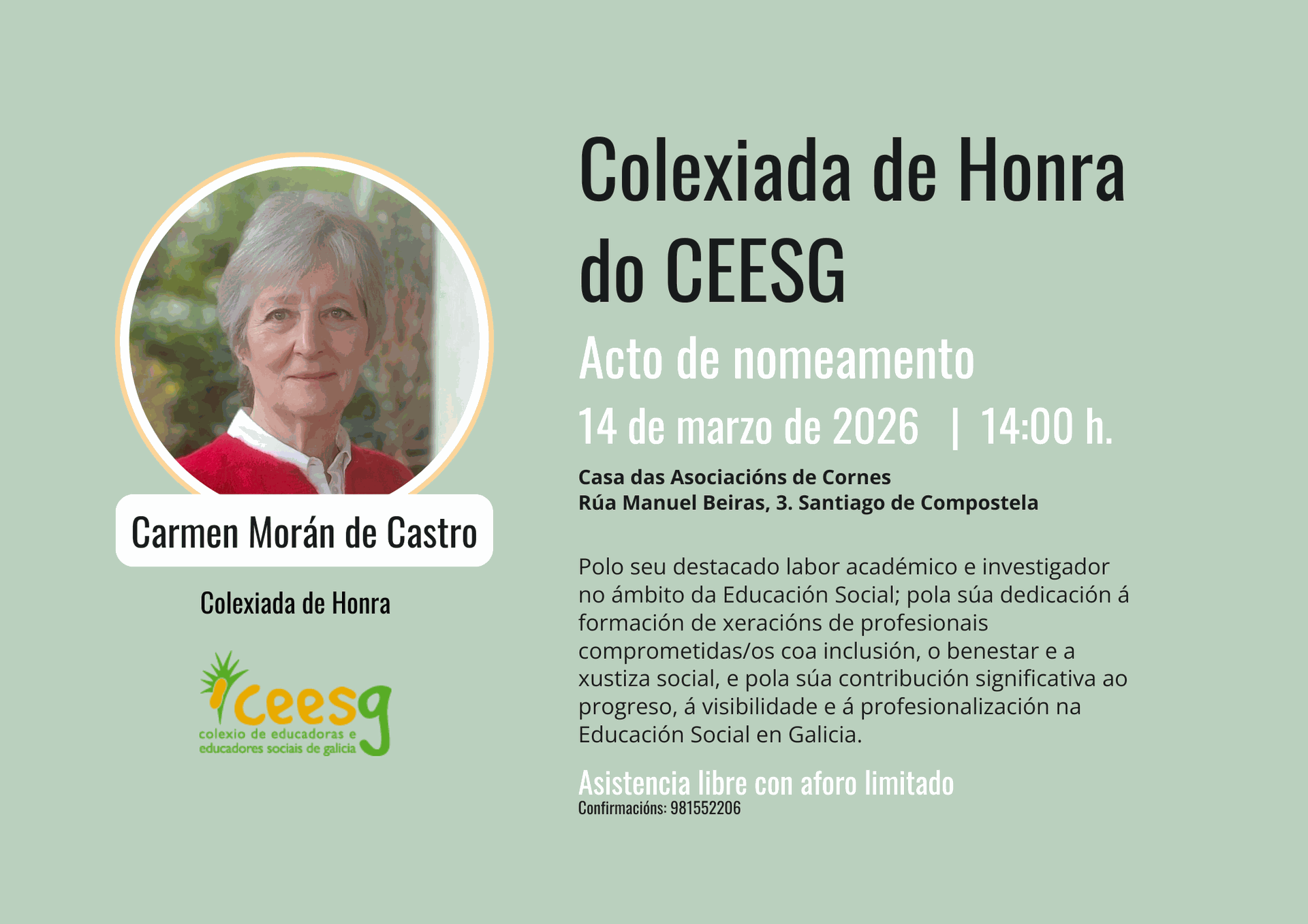 Comprácenos anunciar o nomeamento como Colexiada de Honra do CEESG a Mª Carmen Morán de Castro, recoñecendo así a súa longa e destacada traxectoria no ámbito da Educación Social e a súa significativa contribución académica e investigadora á profesión.